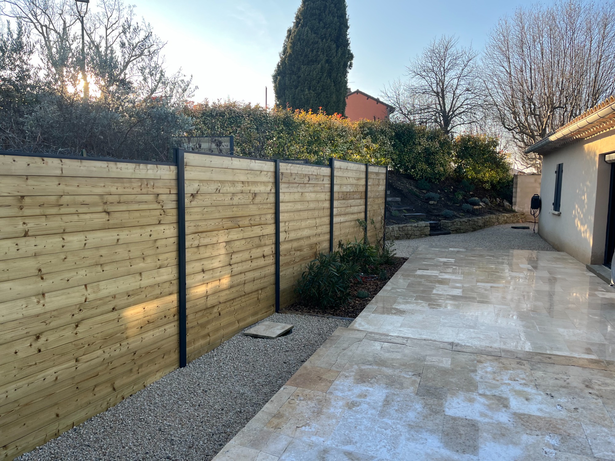 Création de massifs, Murs en pierres sèches, Parties gravillonnées, Plantation de haies, Clôtures.
